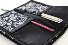 - Double Point/Hook Case - Black and white cloth design includes six inside pockets, opens up bookstyle, and complete zipper enclosure. Small notions pocket on outside. (3 1/2" X 7" when closed)