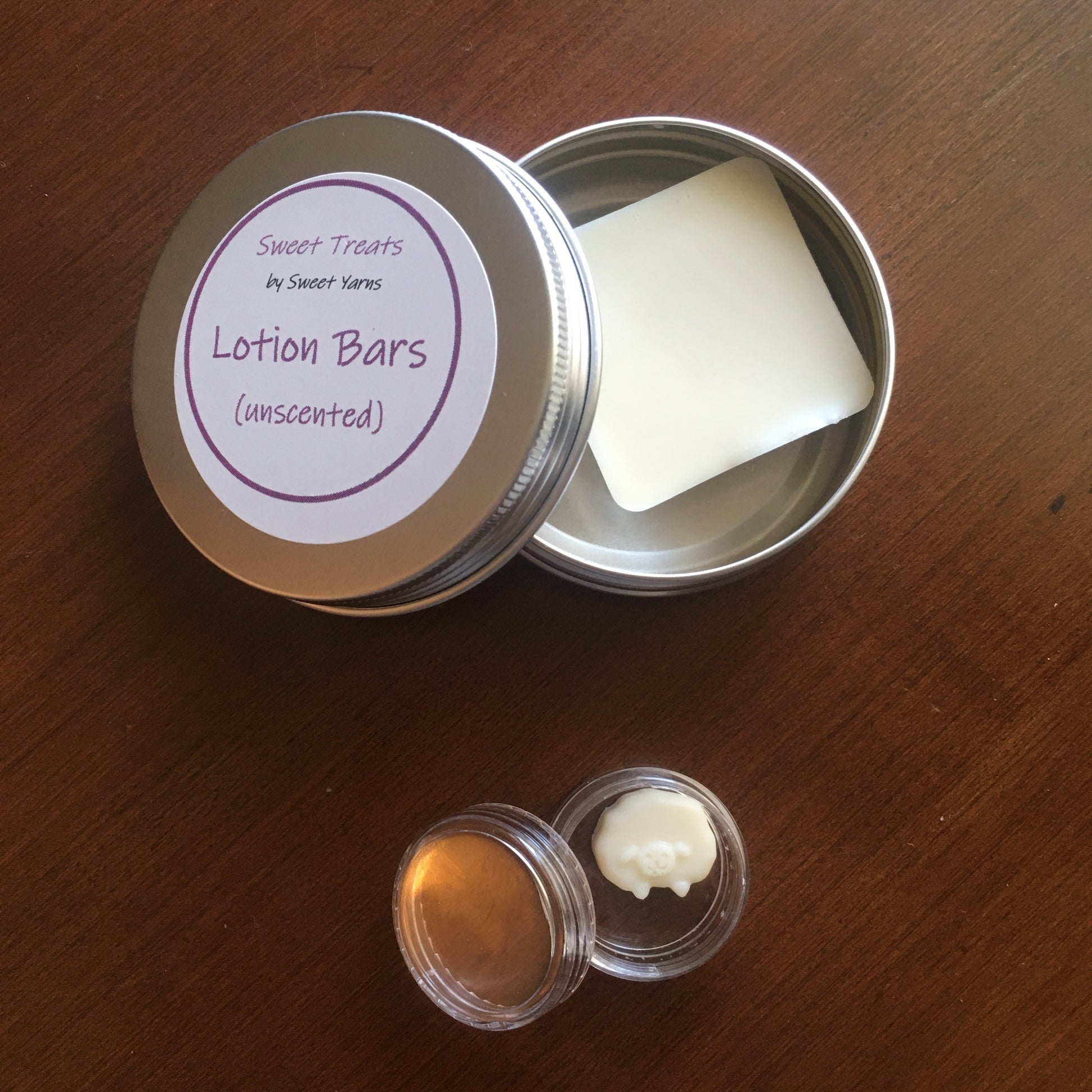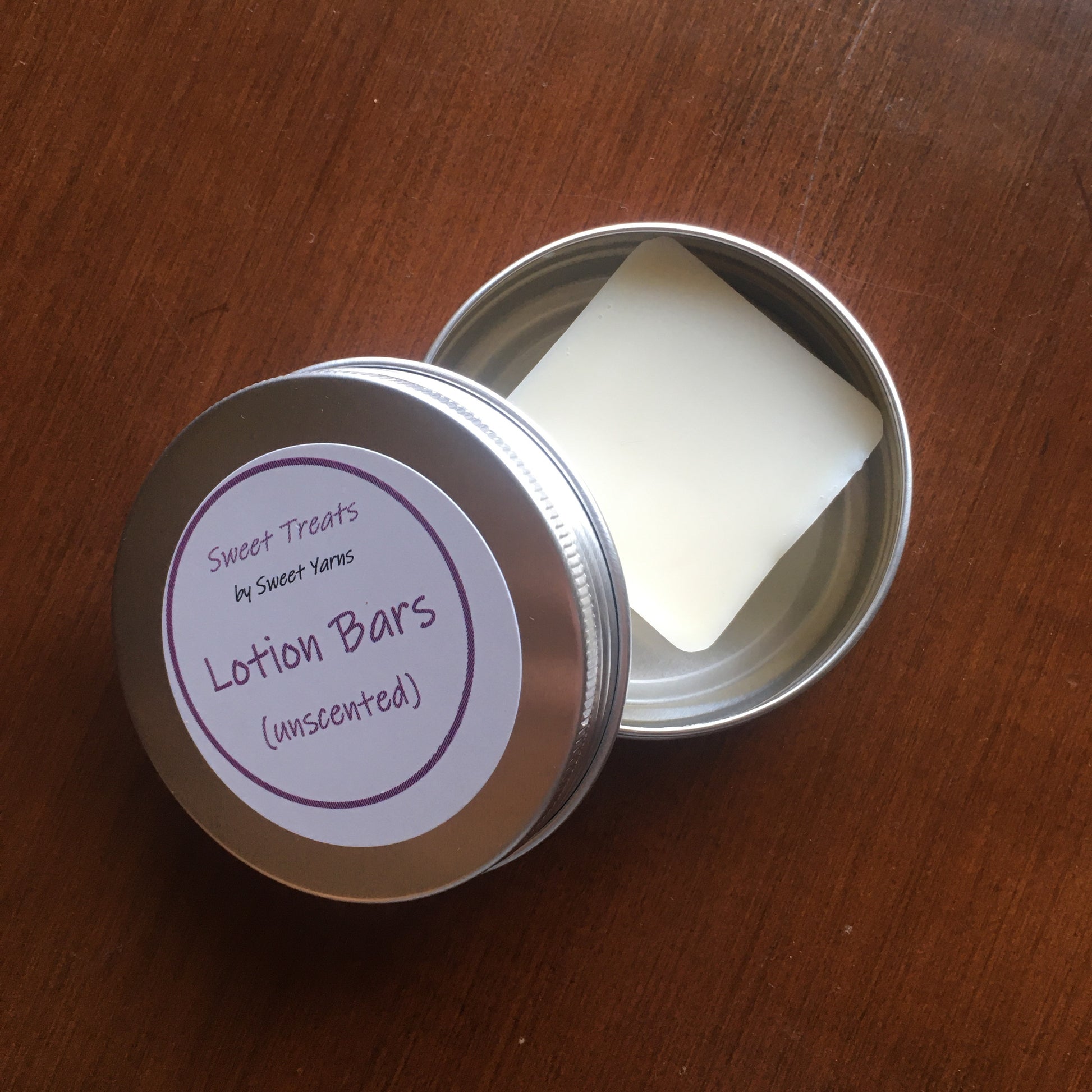 Sweet Yarns' all natural lotion bars are handmade with Shea Butter, Coconut Oil and Beeswax. No scents have been added. These are perfect for crafter's to use. Just rub the bar between your hands, the heat of your hands transfers the lotion from the bar. Rub in as needed.