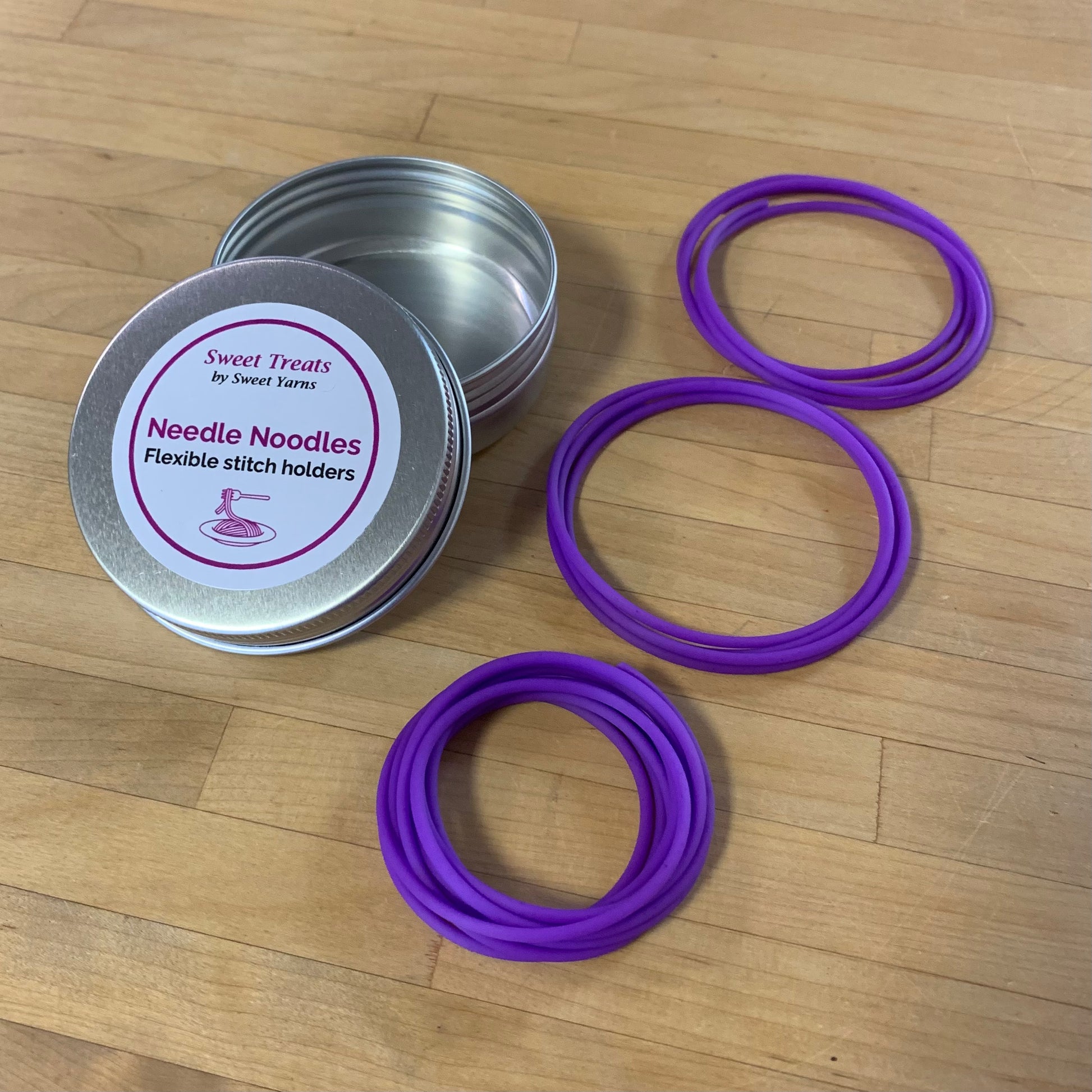 - Needle Noodles - these flexible stitch holders are made from rubber. Just put your needle tip into the end and slide your stitches on. Perfect for putting sweater stitches on hold. Comes with one 60" and two 30" tubes in a tin case.