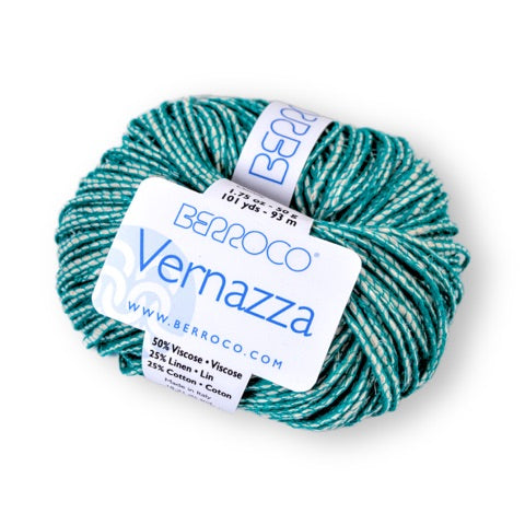 Vernazza's unique construction wraps colorful viscose around a core of undyed cotton and linen. The result is a sophisticated yarn which can be worked at a larger gauge for a relaxed fabric or more tightly for structured pieces.